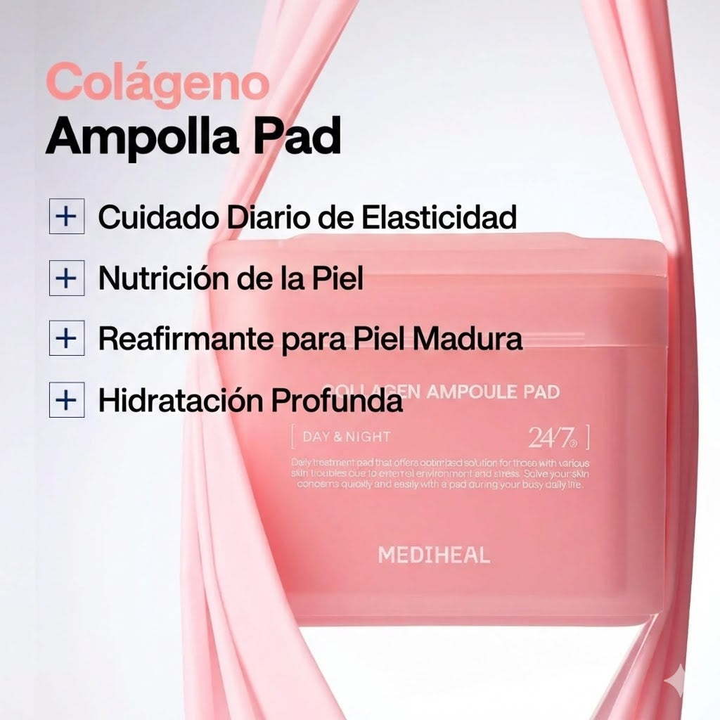 Mediheal Collagen Ampoule Pad son pads pre-impregnados con una esencia tipo ampoule formulados para hidratar intensamente, mejorar la elasticidad de la piel y suavizar la apariencia de líneas finas.